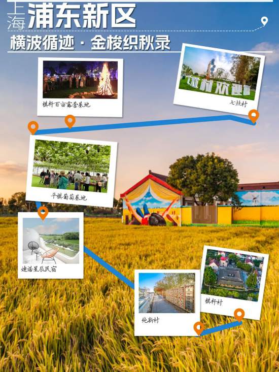 带来别样体验。“山、水、林、田”在此浑然天成,让亲子时光更显温馨。还设有风景食课、爱鹤学馆、亲子活动中心等多元公区,十里果林巧妙融合中草药与健康,棋杆村的千亩葡萄园、稻田观景与葡萄文化节,都能让人深度感受浦东乡村的多样魅力,解锁满载收获与欢笑的金秋田园时光。还有花海葵峰、粉黛秘境、星空营地等特色景点。既能让孩子感受水乡风情、非遗文化,联谊村的“江南如意湾”、稻田与油菜花田,还是想享受古典美学风的休闲午后。